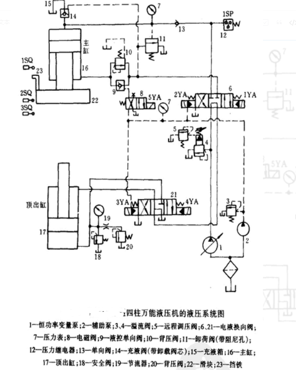 今天本文的重點(diǎn)內(nèi)容來(lái)用圖文列舉說(shuō)明法給大家講下四柱萬(wàn)能液壓機(jī)運(yùn)行中,液壓系統(tǒng)中的主缸與頂出缸是怎么默契的配合工作的。文章開(kāi)始之前請(qǐng)先大致了解下圖中主泵1的圖標(biāo)表示為為高壓、大流量恒功率、(壓力補(bǔ)償)變量泵,最大工作壓力為32 MPa,由遠(yuǎn)程調(diào)壓閥圖標(biāo)5調(diào)節(jié);輔助泵圖標(biāo)2為低壓小流量定量泵,主要用于供應(yīng)電液閥的控制油,其壓力由安全閥圖標(biāo)3調(diào)節(jié)。由此相關(guān)可見(jiàn)四柱萬(wàn)能液壓機(jī)中主缸與頂出缸工作配合是默契的。細(xì)節(jié)步驟分解如下: